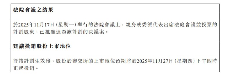 11月17日晚,在香港聯(lián)交所上市的大悅城地產(chǎn)有限公司(00207.HK)發(fā)布公告稱,在今日舉行的法院會(huì)議上,親身或委派代表出席法庭會(huì)議并投票的計(jì)劃股東,已批準(zhǔn)通過(guò)私有化的決議案。 待該計(jì)劃生效后,大悅城地產(chǎn)在聯(lián)交所的上市地位,預(yù)期將于11月27日下午四時(shí)正起撤銷。 公告顯示,于法院會(huì)議日期,大悅城地產(chǎn)已發(fā)行股份總數(shù)為14,231,124,858股,而賦予持有人出席法院會(huì)議并就該計(jì)劃投贊成或反對(duì)票的計(jì)劃股份總數(shù)為4,729,765,214股。在法院會(huì)議上,合共30名代表2,690,937,836股計(jì)劃股份中央結(jié)算系統(tǒng)參與者投票贊成批準(zhǔn)該計(jì)劃的決議案,而合共4名代表16,783,082股計(jì)劃股份中央結(jié)算系統(tǒng)參與者則投票發(fā)對(duì)批準(zhǔn)該計(jì)劃的決議案。 此前,7月31日,大悅城地產(chǎn)的控股公司大悅城控股集團(tuán)股份有限公司(000031.SZ)發(fā)布公告,宣布將私有化。公告指出,大悅城地產(chǎn)擬向除控股公司大悅城控股集團(tuán)和得茂有限公司(公司控股股東中糧集團(tuán)有限公司之全資子公司)以外的其他股東提出私有化建議,擬以協(xié)議安排的方式回購(gòu)股份,并向香港聯(lián)合交易所有限公司申請(qǐng)撤銷上市地位。 本次交易前,大悅城控股集團(tuán)持有大悅城地產(chǎn)9,133,667,644股普通股股份(占大悅城地產(chǎn)已發(fā)行普通股股份總數(shù)約64.18%,占大悅城地產(chǎn)已發(fā)行普通股及可轉(zhuǎn)換優(yōu)先股合計(jì)股份數(shù)約59.59%),得茂持有大悅城地產(chǎn)367,692,000股普通股股份(2.58%)以及1,095,300,778股優(yōu)先股股份。 根據(jù)本次交易安排,協(xié)議生效后,假設(shè)大悅城地產(chǎn)的已發(fā)行股本并無(wú)變動(dòng),大悅城地產(chǎn)的4,729,765,214股計(jì)劃股份將被注銷。作為對(duì)價(jià),原持有計(jì)劃股份的大悅城地產(chǎn)股東有權(quán)就注銷的每股計(jì)劃股份自大悅城地產(chǎn)收取0.62港元現(xiàn)金,總計(jì)約29.32億港元。資金來(lái)源為大悅城地產(chǎn)內(nèi)部資源及/或外部債務(wù)融資。協(xié)議安排生效后,大悅城地產(chǎn)將申請(qǐng)撤銷在香港聯(lián)交所的上市地位。 關(guān)于私有化的原因,大悅城控股集團(tuán)在公告中表示, 近年來(lái)在行業(yè)周期性發(fā)展的影響下,大悅城地產(chǎn)的市場(chǎng)表現(xiàn)呈節(jié)段性波動(dòng),流動(dòng)性也隨之承壓。本次交易是積極應(yīng)對(duì)市場(chǎng)環(huán)境變化的戰(zhàn)略舉措,將顯著優(yōu)化公司治理框架,整合組織架構(gòu)與股權(quán)結(jié)構(gòu)。交易完成后,控股集團(tuán)將增厚對(duì)大悅城地產(chǎn)的權(quán)益,有利于提升公司歸母凈利潤(rùn)。 值得注意的是,上述協(xié)議安排后,控股股東大悅城控股集團(tuán)持股比例將增至96.13%,得茂持股3.87%。這意味著,一旦私有化通過(guò)并落地,大悅城控股集團(tuán)將幾乎全部控股大悅城地產(chǎn)。 財(cái)報(bào)顯示,大悅城地產(chǎn)2025年上半年?duì)I業(yè)總收入為人民幣81.24億元,較去年同期下降5.8%。其中,物業(yè)開(kāi)發(fā)收入為人民幣54.81億元,同比下降8.3%。公司錄得的凈利潤(rùn)為人民幣1.05億元,同比下降26.6%;但若剔除投資物業(yè)稅后公允價(jià)值虧損及匯率虧損約人民幣1.4億元,核心凈利潤(rùn)(按非香港財(cái)務(wù)報(bào)告準(zhǔn)則)約為人民幣2.44億元,同比增長(zhǎng)25.1%。 公開(kāi)資料顯示,大悅城地產(chǎn)是中糧集團(tuán)旗下地產(chǎn)公司,成立于1992年,2013年在香港聯(lián)交所上市。此番私有化后,中糧集團(tuán)的地產(chǎn)平臺(tái)還有A股上市的大悅城控股集團(tuán)。 |