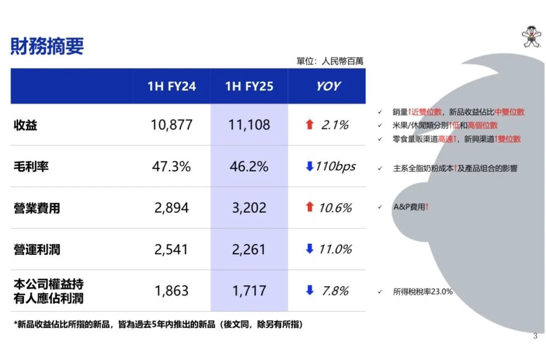 11月24日,中國(guó)旺旺公布中期業(yè)績(jī),截至9月30日止6個(gè)月,公司收益為111.08億元,同比增長(zhǎng)2.1%;公司權(quán)益持有人應(yīng)占利潤(rùn)為17.17億元,同比減少7.8%。期內(nèi),米果大類(lèi)收益同比增長(zhǎng)3.5%(銷(xiāo)量增長(zhǎng)為中個(gè)位數(shù)),達(dá)到21.3億元,在中國(guó)大陸境內(nèi)全渠道實(shí)現(xiàn)增長(zhǎng),其中在新興渠道實(shí)現(xiàn)雙位數(shù)增長(zhǎng),在零食量販渠道實(shí)現(xiàn)高速增長(zhǎng);乳品及飲料類(lèi)2025財(cái)年上半年收益59.413億,同比減少1.1%;休閑食品類(lèi)實(shí)現(xiàn)收益29.402億,較上一財(cái)年同期增長(zhǎng)7.7%,銷(xiāo)量實(shí)現(xiàn)低雙位數(shù)增長(zhǎng)。中國(guó)旺旺還指出,在上半年,公司在電商、OEM等新興渠道持續(xù)保持優(yōu)良表現(xiàn),新興渠道收益獲得雙位數(shù)的良好增長(zhǎng);同時(shí),面對(duì)新零食系統(tǒng)的崛起,公司積極應(yīng)對(duì),主動(dòng)推出針對(duì)零食量販渠道客戶所需的新品并大受消費(fèi)者歡迎,充分彰顯出公司因應(yīng)市場(chǎng)渠道快速變化的戰(zhàn)略成效。 |