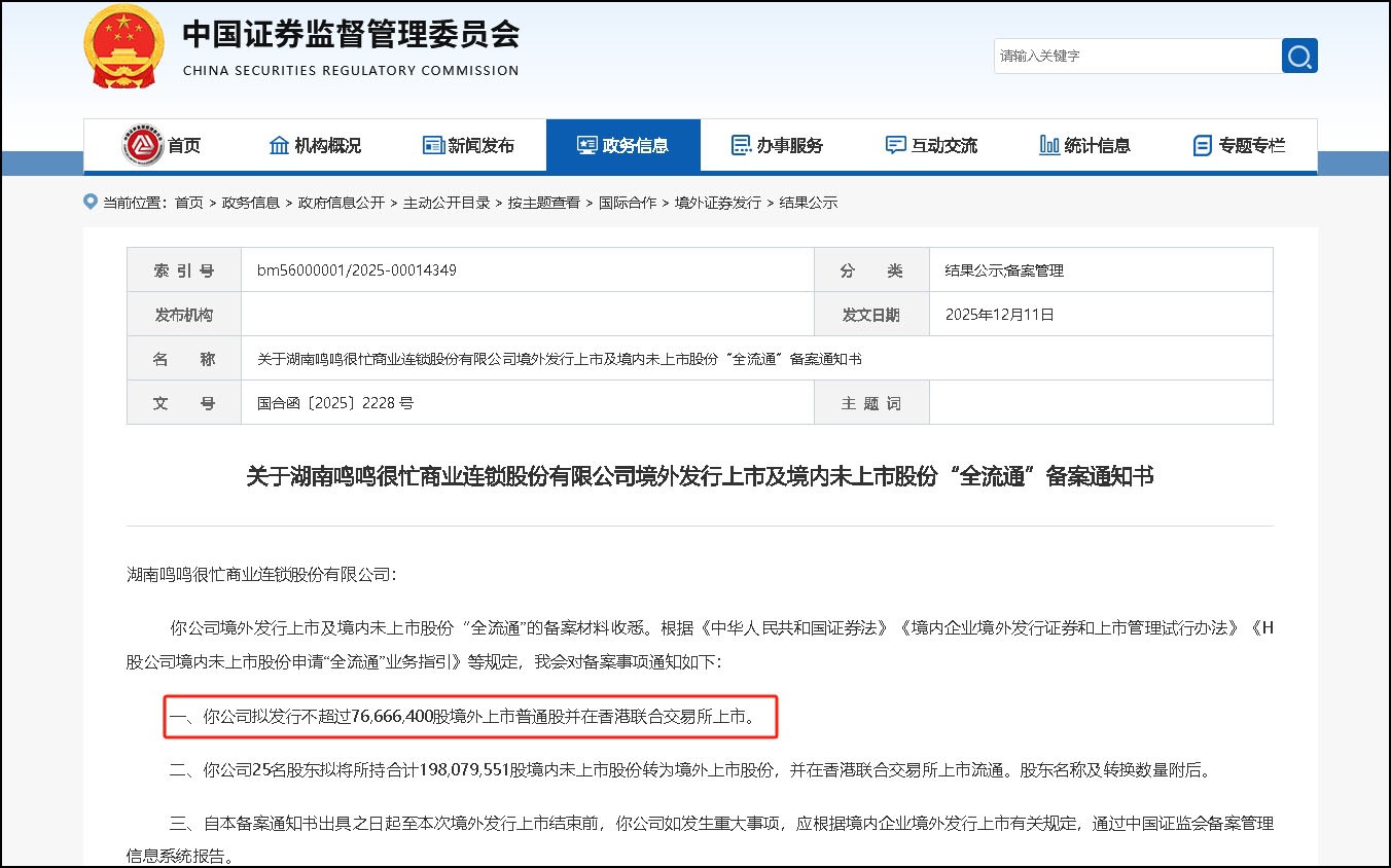 該公司擬發(fā)行不超過(guò)76,666,400股境外上市普通股并在香港聯(lián)合交易所上市,25名股東擬將所持合計(jì)198,079,551股境內(nèi)未上市股份轉(zhuǎn)為境外上市股份,并在香港聯(lián)合交易所上市流通。 據(jù)悉,2025年4月28日,鳴鳴很忙首次向港交所主板遞交上市申請(qǐng),2025年10月28日,公司更新上市申請(qǐng)材料,繼續(xù)推進(jìn)上市進(jìn)程。 根據(jù)招股書(shū),2024年,鳴鳴很忙錄得GMV人民幣555億元;截至2025年6月30日,鳴鳴很忙實(shí)現(xiàn)零售額(GMV)411億元,收入281.2億元,經(jīng)調(diào)整凈利潤(rùn)10.34億元,門(mén)店總數(shù)已達(dá)16783家,覆蓋全國(guó)28個(gè)省份、1327個(gè)縣等市場(chǎng)。經(jīng)營(yíng)質(zhì)量方面,截至2025年上半年,鳴鳴很忙期末現(xiàn)金余額超23.94億元,流動(dòng)資產(chǎn)凈值增至28.27億元,現(xiàn)金充足,資產(chǎn)流轉(zhuǎn)高效,財(cái)務(wù)結(jié)構(gòu)穩(wěn)健。2025年上半年經(jīng)營(yíng)現(xiàn)金流凈額13.95億元,體現(xiàn)強(qiáng)勁造血能力。2025年9月,據(jù)第三方權(quán)威機(jī)構(gòu)弗若斯特沙利文認(rèn)證,鳴鳴很忙成為行業(yè)首家突破2萬(wàn)店的企業(yè)。 |