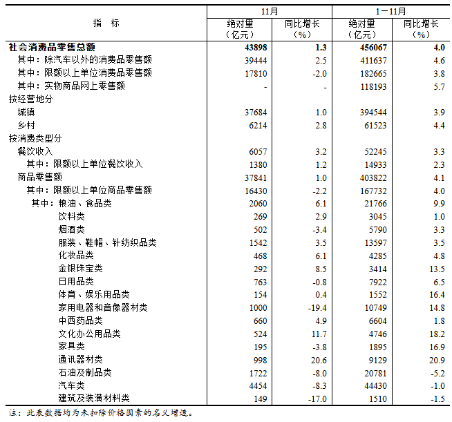 12月15日,據(jù)國家統(tǒng)計局消息,11月份,社會消費品零售總額43898億元,同比增長1.3%。其中,除汽車以外的消費品零售額39444億元,增長2.5%。1-11月份,社會消費品零售總額456067億元,增長4.0%。其中,除汽車以外的消費品零售額411637億元,增長4.6%。 按經(jīng)營單位所在地分,11月份,城鎮(zhèn)消費品零售額37684億元,同比增長1.0%;鄉(xiāng)村消費品零售額6214億元,增長2.8%。1-11月份,城鎮(zhèn)消費品零售額394544億元,增長3.9%;鄉(xiāng)村消費品零售額61523億元,增長4.4%。 按消費類型分,11月份,商品零售額37841億元,同比增長1.0%;餐飲收入6057億元,增長3.2%。1-11月份,商品零售額403822億元,增長4.1%;餐飲收入52245億元,增長3.3%。 1-11月份,全國網(wǎng)上零售額144582億元,同比增長9.1%。其中,實物商品網(wǎng)上零售額118193億元,增長5.7%,占社會消費品零售總額的比重為25.9%;在實物商品網(wǎng)上零售額中,吃類、穿類、用類商品分別增長14.9%、3.5%、4.4%。 |