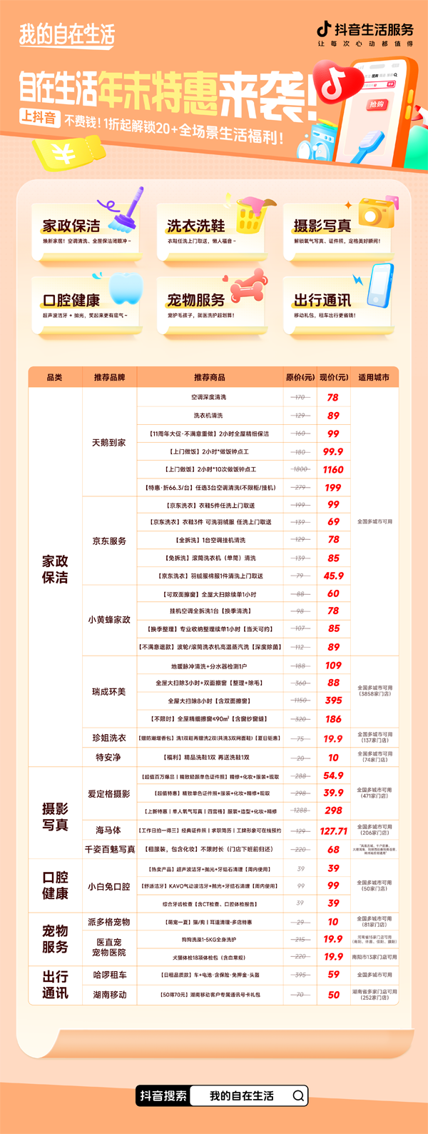 年終掃除的時(shí)節(jié)如期而至,但這一次,我們無需再獨(dú)自苦戰(zhàn)!抖音生活服務(wù)「我的自在生活」第二彈——“年末家務(wù)速通攻略”正式上線。是時(shí)候告別與灰塵油污的漫長纏斗,讓專業(yè)服務(wù)為你一鍵清空所有待辦事項(xiàng),贏回本該屬于自己和家人的寶貴時(shí)光。用最高效的“速通”智慧,迎接一個(gè)真正輕盈、敞亮的新年。 重新定義大掃除:告別耗時(shí)費(fèi)力,擁抱省心高效 曾幾何時(shí),“大掃除”是一場需要全家總動員的體力考驗(yàn);而在今天,它更應(yīng)成為一項(xiàng)關(guān)乎生活品質(zhì)的智慧投資。我們越來越清醒地意識到,歲末最珍貴的資源,莫過于時(shí)間本身。與其將它耗費(fèi)在無盡的重復(fù)勞作中,不如留給溫暖的陪伴、自我的充盈或純粹的放松。 這份“家務(wù)速通攻略”,正是為倡導(dǎo)一種更高效、更聰明的生活選擇——通過專業(yè)服務(wù),精準(zhǔn)、省力地抵達(dá)“窗明幾凈”的終點(diǎn)。當(dāng)你將擦窗、深度保潔、收納整理等事務(wù)妥善托付,所換回的遠(yuǎn)不只是一個(gè)潔凈的家,更是一整個(gè)周末的閑暇、一份卸下重?fù)?dān)后的舒暢心情,以及全家圍坐時(shí)毫無倦意的溫馨時(shí)光。 限時(shí)好券+特惠好品:自在生活,一鍵直達(dá) 真正的自在,始于輕松的決策與實(shí)惠的選擇。本次活動,我們不僅匯聚值得信賴的家政品牌,更奉上年度誠意優(yōu)惠,助你輕松開啟煥新生活。 12月12日上午10點(diǎn),記得準(zhǔn)時(shí)鎖定抖音「我的自在生活」主會場,搶限量 “8元無門檻居家生活券”,更可疊加享受 “滿120元減18元” 等多重平臺優(yōu)惠。主會場內(nèi)特設(shè)“年度煥新特惠專區(qū)”,眾多精選品質(zhì)服務(wù)直接1折起,為你提供最具誠意的省心之選。 天鵝到家?guī)砟杲K專項(xiàng)優(yōu)惠:空調(diào)深度清洗低至約4.6折,3臺清洗套餐折算單價(jià)僅約66.3元;同時(shí)還提供洗衣機(jī)清洗、多時(shí)長精細(xì)保潔乃至上門做飯次卡等多樣化貼心服務(wù)。京東服務(wù)則專注于衣鞋洗護(hù)與家電健康,推出任洗套餐、羽絨服專洗,以及空調(diào)全拆洗、洗衣機(jī)深度清潔等專業(yè)養(yǎng)護(hù)項(xiàng)目。小黃蜂家政全面覆蓋從全屋大掃除、空調(diào)深度清洗,到即約即享的專業(yè)收納整理與洗衣機(jī)高溫除菌服務(wù),并鄭重承諾“不滿意退款”,確保你的每一次消費(fèi)都安心無憂。 選擇這些專業(yè)服務(wù),意味著你選擇的不僅是一次徹底的清潔,更是一套包含科學(xué)流程、環(huán)保物料、規(guī)范操作與全程保障的高效解決方案,讓你從瑣碎與顧慮中徹底解脫,從容享受成果。 除了深度家務(wù)服務(wù),你還可以在主會場一站式發(fā)現(xiàn)并囤購其他提升生活幸福感的熱門好品:無論是記錄重要時(shí)刻的海馬體精致證件照、打造家庭溫馨記憶的愛定格照相館套餐,還是關(guān)愛家庭成員的醫(yī)直寵專業(yè)寵物洗護(hù),抑或是各類風(fēng)格獨(dú)特的個(gè)人與家庭寫真拍攝服務(wù)……豐富選擇,旨在滿足你對美好生活的多維想象,真正實(shí)現(xiàn) “一鍵囤券,輕松煥新全生活”。 全場景速通攻略:對癥下藥,精準(zhǔn)“減負(fù)” 面對繁雜的年末清潔,無需再望而生畏。我們深入洞察核心痛點(diǎn),將其轉(zhuǎn)化為清晰高效的解決場景。無論你的困擾是時(shí)間緊迫、關(guān)注健康、追求通透視野,還是講究精致、需要理順空間或籌備飯菜,都有對應(yīng)的專業(yè)方案為你精準(zhǔn)“速通”。 如果你渴望徹底解放雙手,全屋深度保潔能為你實(shí)現(xiàn)空間的“一鍵重置”,專業(yè)團(tuán)隊(duì)的高溫蒸汽作業(yè)讓除塵除菌不留死角。若你更關(guān)注家人健康的內(nèi)在守護(hù),家電深度煥新服務(wù)則通過對空調(diào)、洗衣機(jī)、油煙機(jī)的專業(yè)拆洗與高溫消殺,從源頭祛除隱患。對于熱愛陽光與明亮視野的“視覺黨”,窗戶透亮工程憑借專業(yè)的雙面擦窗技術(shù),能帶來無水漬、無痕漬的明亮通透。 而注重外在形象的你,可以通過衣物鞋履煥新服務(wù),讓心愛的衣物獲得分區(qū)精洗,鞋履得到深度保養(yǎng)。若被物品堆積困擾,科學(xué)收納規(guī)劃將由整理師上門,幫助重新規(guī)劃空間邏輯,釋放壓迫感。至于籌備飯菜的煩惱,則完全可以交給上門做飯服務(wù),從定制菜單、采買烹飪到餐后清潔全程代勞,讓你輕松坐享美味。 達(dá)人助陣,話題引爆:引領(lǐng)“速通”新風(fēng)尚 本次“年末家務(wù)速通攻略”,我們依然特別邀請了多位熱愛生活的達(dá)人,如 @我是小程同學(xué)、@劉格格、@吳拽拽 等,作為“自在生活推薦官”。他們將通過親身體驗(yàn)與真實(shí)分享,以短視頻形式帶你直觀感受專業(yè)服務(wù)的效率與魅力,解鎖更多家務(wù)煥新的靈感與技巧。 12月12日,“愛生活星推官”陳小紜空降4大品牌直播間,聯(lián)動萬歲山景區(qū)初雪場景,帶來了一場長達(dá)數(shù)小時(shí)的自在生活浪漫直播盛宴,突破2796萬+, 從下午15:00開始,她依次亮相了:樊文花、芳香世家、丸碧、瞧享 四大品牌直播間,與用戶分享護(hù)膚變美心得,并帶去專屬直播間福利。 同時(shí),我們也邀請你一起參與到熱點(diǎn)話題 #年末家務(wù)速通攻略 的共創(chuàng)中來。在這