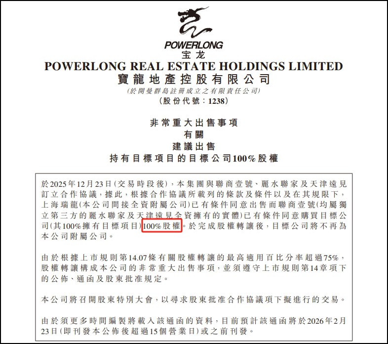 12月23日晚間,寶龍地產(chǎn)控股有限公司發(fā)布了“非常重大出售事項(xiàng)”公告。 公告指出,于2025年12月23日,集團(tuán)與聯(lián)商壹號、麗水聯(lián)家及天津遠(yuǎn)見訂立合作協(xié)議。根據(jù)合作協(xié)議所載列的條款及條件以及在其規(guī)限下,上海瑞龍(公司間接全資附屬公司)已有條件同意出售而聯(lián)商壹號(均屬獨(dú)立第三方的麗水聯(lián)家及天津遠(yuǎn)見全資擁有的實(shí)體)已有條件同意購買目標(biāo)公司杭州華展房地產(chǎn)開發(fā)有限公司(其100%擁有目標(biāo)項(xiàng)目)100%股權(quán),交易代價(jià)初步定為10億元。于完成股權(quán)轉(zhuǎn)讓后,目標(biāo)公司將不再為公司附屬公司。 此次交易標(biāo)的為杭州濱江寶龍城之購物中心綜合體以及稱為杭州濱江寶龍藝珺酒店。根據(jù)合作協(xié)議可知,協(xié)定總資產(chǎn)價(jià)值為24.5億元,初步股權(quán)代價(jià)為10億元。 公告還顯示,寶龍地產(chǎn)未來亦有權(quán)按預(yù)先協(xié)定的代價(jià)基準(zhǔn)從聯(lián)商壹號回購目標(biāo)公司及目標(biāo)項(xiàng)目,使集團(tuán)可根據(jù)未來各階段戰(zhàn)略布局、流動性及業(yè)務(wù)需求,選擇重新取得目標(biāo)公司及目標(biāo)項(xiàng)目的所有權(quán)及控制權(quán)。 據(jù)悉,估計(jì)股權(quán)轉(zhuǎn)讓的所得款項(xiàng)凈額約為人民幣9.97億元。在該等股權(quán)轉(zhuǎn)讓所得款項(xiàng)凈額中,公司擬將45%用于其物業(yè)發(fā)展以確保按時(shí)交付,20%用于一般運(yùn)營開支,15%用于稅項(xiàng)開支,10%用于有關(guān)集團(tuán)境外重組的開支,10%用于有關(guān)集團(tuán)境內(nèi)重組的開支。 此外,接盤方聯(lián)商壹號商業(yè)管理有限公司的股東為麗水聯(lián)融管理咨詢合伙企業(yè)(有限合伙)和麗水聯(lián)融壹號股權(quán)投資合伙企業(yè)(有限合伙)。其背后的大股東是陽光人壽保險(xiǎn)股份有限公司。 資料顯示,杭州寶龍城綜合體項(xiàng)目總建筑面積40萬㎡,包括酒店式公寓、購物中心、199米超高層甲級寫字樓、商業(yè)街區(qū)等業(yè)態(tài)。其中杭州濱江寶龍藝珺酒店擁有175間客房,并于2017年12月開始營運(yùn)。 濱江寶龍城購物中心總建筑面積約13.7萬方(不含停車場),共有5層地上樓層和2層地下樓層,項(xiàng)目2016年12月開業(yè),據(jù)悉開業(yè)首日客流量超過22萬人次,兩天銷售額近2000萬元。 自開業(yè)以來,濱江寶龍城一直是杭州濱江商業(yè)的流量代表,項(xiàng)目團(tuán)隊(duì)積極的品牌更新及策劃出色的營銷活動,讓項(xiàng)目一直保持著高度市場活力。據(jù)聯(lián)商網(wǎng)此前統(tǒng)計(jì)的杭州商場2024年銷售榜數(shù)據(jù)顯示,濱江寶龍城2024年銷售額含新能源及街區(qū)情況下達(dá)33億元,位于杭州前列。 |