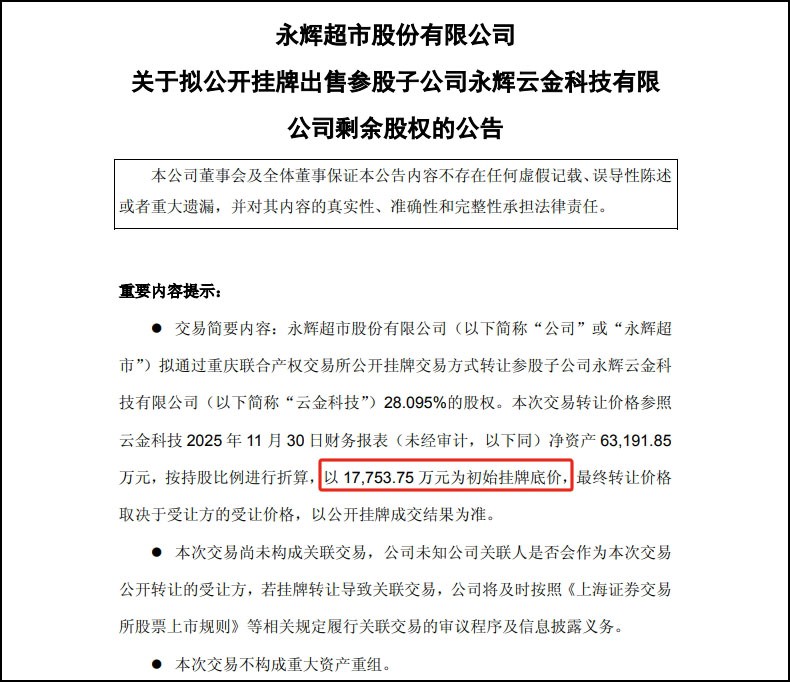 12月29日,永輝超市公告稱,公司擬通過重慶聯(lián)合產(chǎn)權(quán)交易所公開掛牌轉(zhuǎn)讓參股子公司云金科技28.095%股權(quán),掛牌底價(jià)1.78億元。 本次定價(jià)以云金科技2025年11月30日凈資產(chǎn)6.32億元為基準(zhǔn),按持股比例折算確定初始價(jià)格,最終交易金額以公開競(jìng)價(jià)結(jié)果為準(zhǔn)。 資料顯示,永輝云金科技2019年成立,注冊(cè)資本5億元,擁有重慶永輝小額貸款有限公司、永輝青禾商業(yè)保理(重慶)有限公司兩家子公司。據(jù)了解,永輝云金成立之初是永輝超市的全資子公司。2023年6月,永輝超市將永輝云金65%股份作價(jià)3.78億元轉(zhuǎn)讓給了上海派慧。今年10月,永輝超市持股比例由35%被動(dòng)稀釋至28.095%,上海派慧則增至71.905%,本次掛牌完成后,永輝將徹底退出云金科技。 |