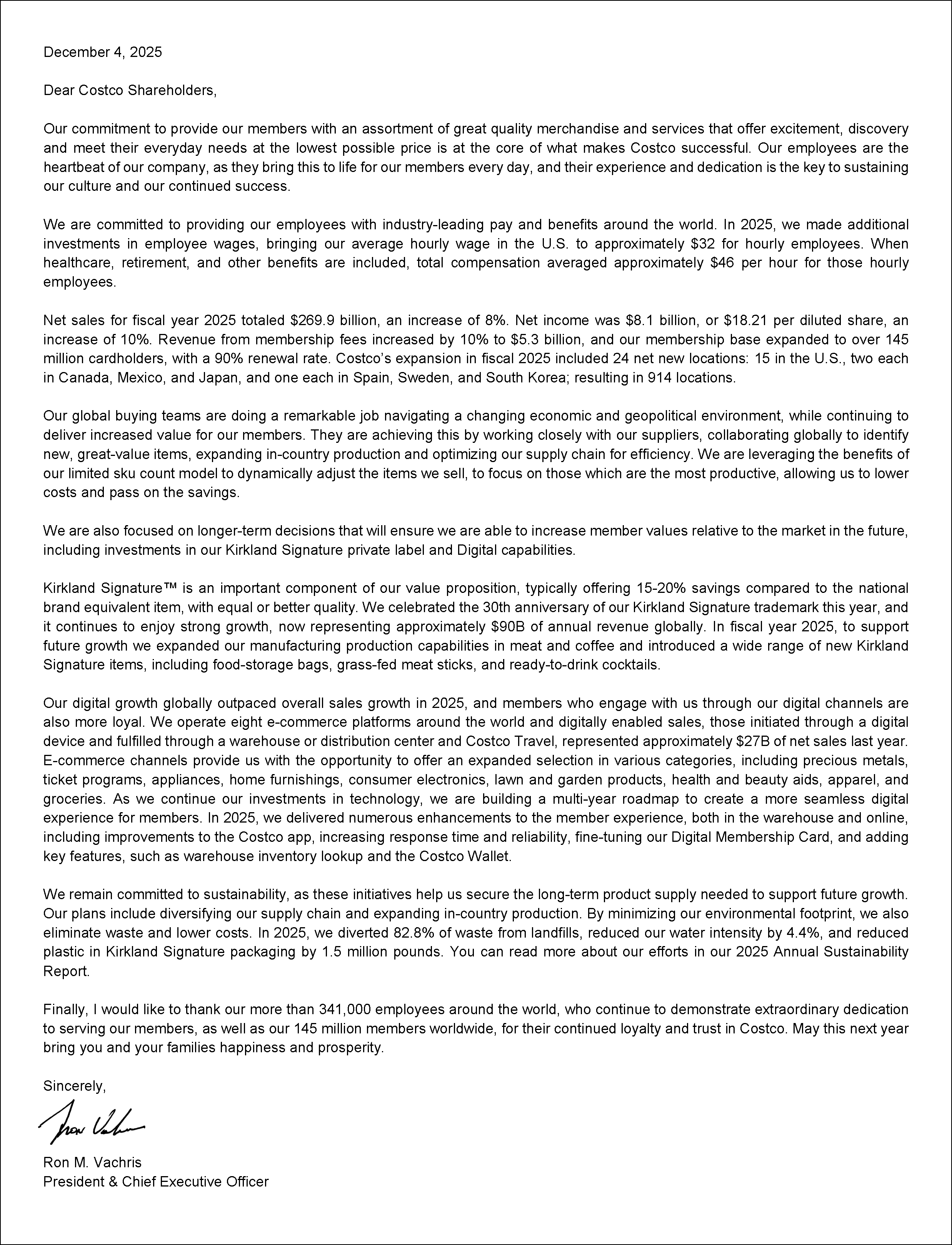 去年底,Costco開市客公司總裁兼首席執(zhí)行官Ron M. Vachris在2025財年年度報告中發(fā)布致股東信。 信中指出,會員制倉儲巨頭Costco在2025財年凈銷售額2699億美元(約1.88萬億元人民幣),同比增長8%;凈利潤81億美元(約565億元人民幣),增長9.9%;會員費收入53億美元(約370億元人民幣),增長10%。全球持卡會員達(dá)1.45億,續(xù)費率90%。自有品牌Kirkland Signature年銷售額超900億美元(約6280億元人民幣)。 截至財年末,Costco在全球運營914家門店,覆蓋美國、加拿大、墨西哥、日本、英國、澳大利亞、中國(大陸7家)等市場;2026財年計劃新增約22家門店,并繼續(xù)擴充Kirkland Signature產(chǎn)品線。 以下為致股東信全文(中文翻譯): 尊敬的Costco股東們: 我們致力于為會員提供一系列優(yōu)質(zhì)商品與服務(wù),這些商品與服務(wù)能夠帶來驚喜與探索的樂趣,并滿足他們的日常需求,同時以盡可能低的價格實現(xiàn)這一目標(biāo)。這正是 Costco 成功的核心所在。 我們的員工是公司的心臟,他們?nèi)諒?fù)一日地為會員帶來這一切,他們的經(jīng)驗與奉獻(xiàn)精神是維系公司文化和持續(xù)取得成功的關(guān)鍵。 我們致力于在全球范圍內(nèi)為我們的員工提供業(yè)內(nèi)領(lǐng)先的薪資和福利待遇。2025年,我們進(jìn)一步對員工薪資進(jìn)行了投入,將美國時薪工的平均時薪提高至約32美元(約合人民幣223元)。若將醫(yī)療、退休及其他福利納入考慮,這些時薪工的整體薪酬平均約為每小時46美元(約合人民幣321元)。 2025財年,Costco凈銷售額總計為2699億美元(約合人民幣1.88萬億元),同比增長8%;凈利潤為81億美元(約合人民幣565億元),即每股攤薄收益為18.21美元(約合人民幣127元),同比增長10%。會員費收入增長了10%,達(dá)到53億美元(約合人民幣370億元);會員基礎(chǔ)擴大至超過1.45億持卡用戶,續(xù)費率達(dá)到90%。 門店拓展方面,2025財年Costco在全球凈新增24家門店:15家在美國,加拿大、墨西哥和日本各2家,西班牙、瑞典和韓國各1家。截至財年末,Costco全球門店總數(shù)達(dá)914家。 我們的全球采購團隊在不斷變化的經(jīng)濟和地緣政治環(huán)境中做出了卓越貢獻(xiàn),持續(xù)為會員創(chuàng)造更大價值。他們通過與供應(yīng)商密切合作、識別新商品、擴大本地生產(chǎn)和優(yōu)化供應(yīng)鏈來實現(xiàn)這一目標(biāo)。我們利用精簡SKU模式的優(yōu)勢,動態(tài)調(diào)整在銷商品,聚焦產(chǎn)出效益最高的品類,從而降低成本并將節(jié)省下來的費用回饋給會員。 我們同樣著眼于長期決策,以確保我們未來能夠提升會員價值、使其競爭力優(yōu)于市場的水平,其中包括對Kirkland Signature自有品牌和數(shù)字化能力的投資。 自有品牌“Kirkland Signature”是我們價值主張的重要組成部分,通常比同等或更好質(zhì)量的全國品牌價格低15-20%。 今年我們慶祝了 Kirkland Signature 商標(biāo)成立30周年,該品牌如今繼續(xù)保持著強勁的增長勢頭,全球年營業(yè)額現(xiàn)已達(dá)到約900億美元(約合人民幣6280億元)。在2025財年,為支持未來的增長,我們擴大了肉類和咖啡領(lǐng)域的制造生產(chǎn)能力,并推出了種類繁多的全新 Kirkland signature產(chǎn)品,包括食品儲存袋、草飼肉條以及即飲雞尾酒等。 2025年,我們的全球數(shù)字業(yè)務(wù)增長速度超過了整體銷售增長幅度,并且通過數(shù)字渠道與我們互動的會員也更加忠誠。我們在全球運營著8個電子商務(wù)平臺,上一財年,由數(shù)字終端發(fā)起,由倉庫、配送中心及Costco Travel履約的數(shù)字化驅(qū)動的銷售額,達(dá)到約270億美元(約合人民幣1883億元)。 電子商務(wù)渠道為我們能夠在多個品類提供更廣泛的選擇,包括貴金屬、票務(wù)項目、大家電、家居用品、消費電子產(chǎn)品、草坪花園用品、健康美容產(chǎn)品、服裝以及雜貨等。 隨著我們持續(xù)加大在科技領(lǐng)域的投資力度,我們正在制定一項為期數(shù)年的路線圖,旨在為廣大會員提供更加無縫的數(shù)字體驗。 2025年,我們在實體店與線上均推出多項會員體驗升級,包括優(yōu)化化Costco App、提升響應(yīng)速度與可靠性、微調(diào)數(shù)字會員卡,并新增了關(guān)鍵功能如庫存查詢和Costco錢包。 我們始終致力于可持續(xù)發(fā)展,因為這些舉措有助于確保長期的產(chǎn)品供應(yīng),從而為未來的增長提供支持。我們的計劃包括拓展供應(yīng)鏈多元化以及擴大國內(nèi)生產(chǎn)范圍。通過最大限度地減少對環(huán)境的影響,我們還能有效消除廢棄物并降低成本。 2025年,我們已將82.8%的廢棄物從垃圾填埋場轉(zhuǎn)移出來,水使用強度降低了4.4%,Kirkland signature 包裝中的塑料使用量減少了150萬磅。您可以在2025年度可持續(xù)發(fā)展報告中了解更多。 最后,我謹(jǐn)向我們在全球超過34.1萬名雇員致以誠摯的謝意,他們始終以卓越的奉獻(xiàn)精神服務(wù)我們的會員;同時也要感謝全球1.45億會員對Costco長期以來的忠誠與信任。祝您和家人在新的一年里幸福繁榮。 此致 Ron M. Vachris總裁兼首席執(zhí)行官 |