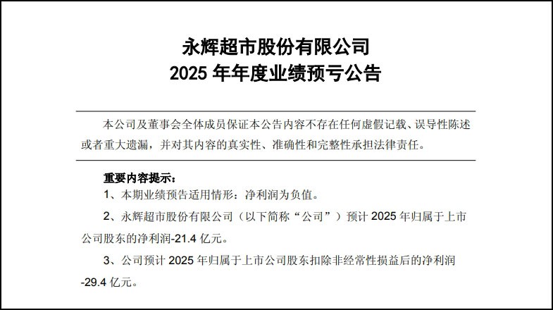 1月20日,永輝超市發(fā)布2025年業(yè)績(jī)預(yù)虧公告,預(yù)計(jì)2025年歸屬于上市公司股東的凈利潤(rùn)虧損21.4億元,上年同期為虧損14.7億元。公司預(yù)計(jì)2025年歸屬于上市公司股東扣除非經(jīng)常性損益后的凈利潤(rùn)虧損29.4億元,上年同期為虧損24.1億元。 對(duì)于業(yè)績(jī)預(yù)虧的原因,公告稱,2025年,永輝超市進(jìn)行了重大的經(jīng)營(yíng)戰(zhàn)略調(diào)整,從“規(guī)模擴(kuò)張”轉(zhuǎn)向“質(zhì)量增長(zhǎng)”,重新定位了“新永輝、新品質(zhì)”的戰(zhàn)略發(fā)展。 門店布局方面,公司報(bào)告期內(nèi)深度調(diào)改了315家門店,并關(guān)閉了381家與公司未來戰(zhàn)略定位不相符的門店。門店調(diào)改對(duì)公司利潤(rùn)的影響主要包含調(diào)改相關(guān)的資產(chǎn)報(bào)廢損失、停業(yè)裝修營(yíng)業(yè)收入損失、一次性開辦費(fèi)投入等,其中資產(chǎn)報(bào)廢及一次性投入合計(jì)約9.1億元。 此外,門店因停業(yè)裝修產(chǎn)生的毛利額損失預(yù)估約3億元。與此同時(shí),關(guān)閉381家門店也產(chǎn)生了較大損失,主要包含資產(chǎn)報(bào)廢損失、人員優(yōu)化離職補(bǔ)償、租賃相關(guān)的違約賠償?shù)取?/div> 商品策略方面,公司首先改革了供應(yīng)鏈,秉承“陽光透明、品質(zhì)驅(qū)動(dòng)、效率提升”的理念,圍繞“陽光供應(yīng)鏈、裸價(jià)直采、核心聚焦、冷鏈升級(jí)、門店協(xié)同”五大方向展開,通過系統(tǒng)性舉措破解傳統(tǒng)供應(yīng)鏈痛點(diǎn)。為此,公司短期面臨缺貨及毛利率下滑的壓力,對(duì)公司營(yíng)業(yè)收入造成了一定的影響,隨著供應(yīng)鏈改革的深入,上述影響已逐步消除。 對(duì)外投資及資產(chǎn)減值方面,公司持有的境外股權(quán)投資Advantage Solutions股票因股價(jià)持續(xù)下跌本年確認(rèn)公允價(jià)值變動(dòng)損益-2.36億元。此外,公司對(duì)持有的長(zhǎng)期資產(chǎn)(主要為持續(xù)虧損門店資產(chǎn))進(jìn)行減值測(cè)試,并計(jì)提了減值準(zhǔn)備。根據(jù)初步測(cè)算,2025年度公司預(yù)計(jì)將計(jì)提長(zhǎng)期資產(chǎn)減值1.62億元。 |