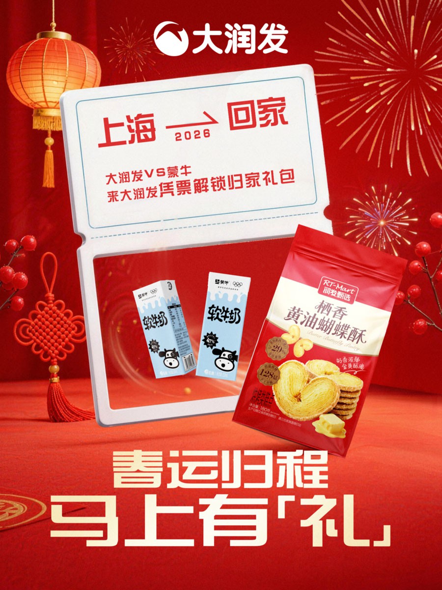 春運將至,為溫暖返鄉(xiāng)人的旅途,零售品牌大潤發(fā)與乳業(yè)品牌蒙牛聯(lián)合發(fā)起“春運歸程馬上有‘禮’”特別行動。自2026年2月1日起,消費者憑當月從上海出發(fā)的返鄉(xiāng)交通票證,即可于上海大潤發(fā)閘北店和張江店免費兌換一份獨家“歸家禮包”,內(nèi)含蒙牛牛奶與大潤發(fā)甄選蝴蝶酥,用一份甜暖的實物關(guān)懷,陪伴消費者踏上歸途。 此次活動精準捕捉了春運期間離滬人群的情感需求,將商業(yè)關(guān)懷嵌入“出發(fā)前”這一具體場景。大潤發(fā)門店成為游子離滬前的“最后一站溫暖補給站”,這份基于車票憑證的禮贈,超越了簡單的促銷,體現(xiàn)了品牌對消費者歸家旅程的深度理解和溫情陪伴。 與此同時,大潤發(fā)已全面開啟年貨季。門店內(nèi)不僅年味裝飾紛呈,更推出了多款定制年貨禮盒,以及涵蓋糕點、堅果零食、牛肉水產(chǎn)、酒水飲料等在內(nèi)的豐富新年商品,充分滿足消費者一站式購置年禮、裝點團圓飯桌的需求,是消費者新春采購的理想選擇。 此次與蒙牛的跨界合作,也是大潤發(fā)品牌年輕化戰(zhàn)略的一次生動實踐。通過綁定“車票”這一情感載體,設(shè)計“解鎖”禮包的互動玩法,大潤發(fā)正以更創(chuàng)新、更貼近當下消費者情感的方式刷新品牌形象,從傳統(tǒng)零售賣場向能夠創(chuàng)造驚喜、參與重要時刻的現(xiàn)代生活空間轉(zhuǎn)型。 未來,大潤發(fā)將持續(xù)深化其作為社區(qū)生活暖心樞紐的角色,不僅提供優(yōu)質(zhì)商品,更致力于成為消費者生活中值得信賴的陪伴者。這份“歸家禮包”,既是一份新年禮物,也是大潤發(fā)與消費者溫暖同行的誠摯承諾。 |